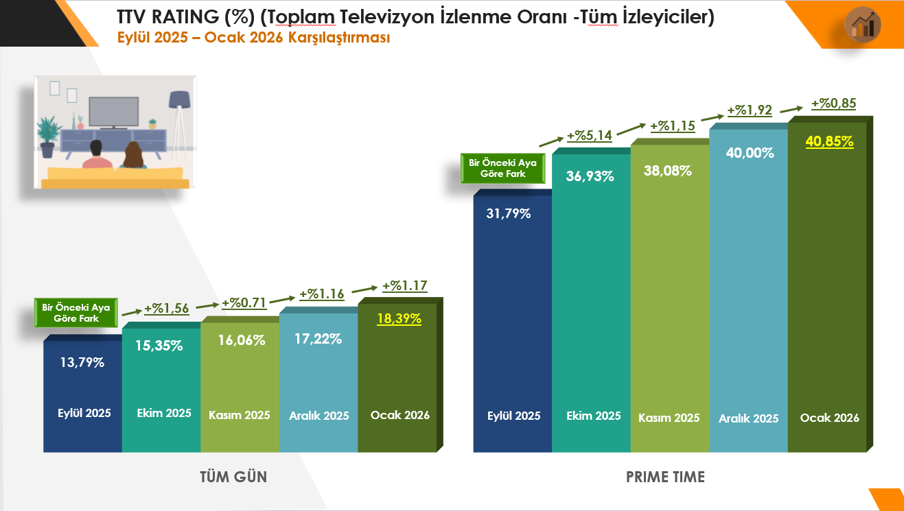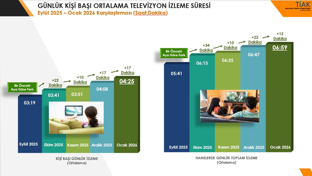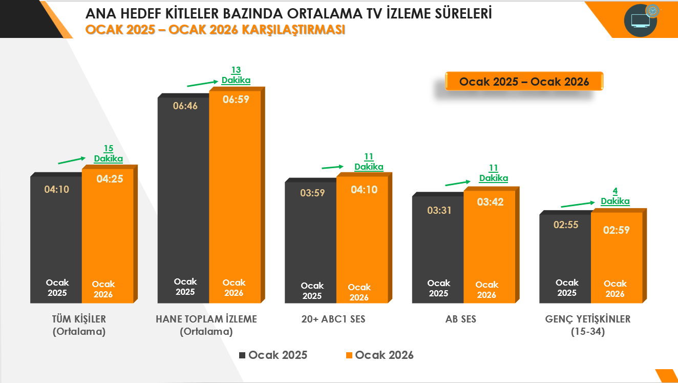 2025 Ocak - 2026 Ocak ayları karşılaştırıldığında 2026 yılında kişi başı ortalama izleme süresindeki artışın 15 dakika olduğu görülmekte. Geçen yıla göre Tüm Kişilerde görülen bu artış tüm ana hedef kitlelerde de gözlenmekte; 20+ ABC1 hedef kitlesinde artış 11 Dakika, AB SES Bireyler Hedef Kitlesinde 11 Dakika izleme süresi artışı.